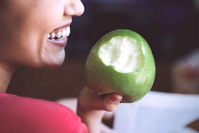 После приёма пищи чувствуете неприятный привкус во рту и налёт на зубах? Едете в поезде или вообще отправились в горный поход? Что ж, когда нет возможности использовать зубную щётку, пожуйте яблоко. Твёрдый фрукт поможет механически очистить полость рта от кусочков еды, а также спровоцирует повышенное слюноотделение. И никакого налёта.